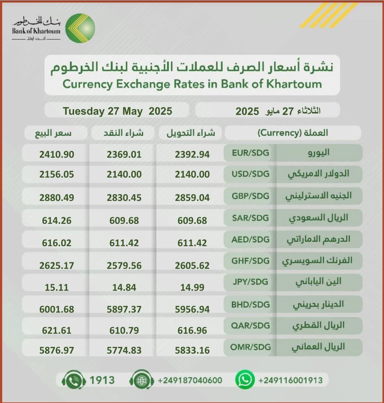 متابعات _ السودان الان _ أعلن بنك الخرطوم عن أسعار العملات الأجنبية مقابل الجنيه السوداني اليوم الثلاثاء 27 مايو 2025م