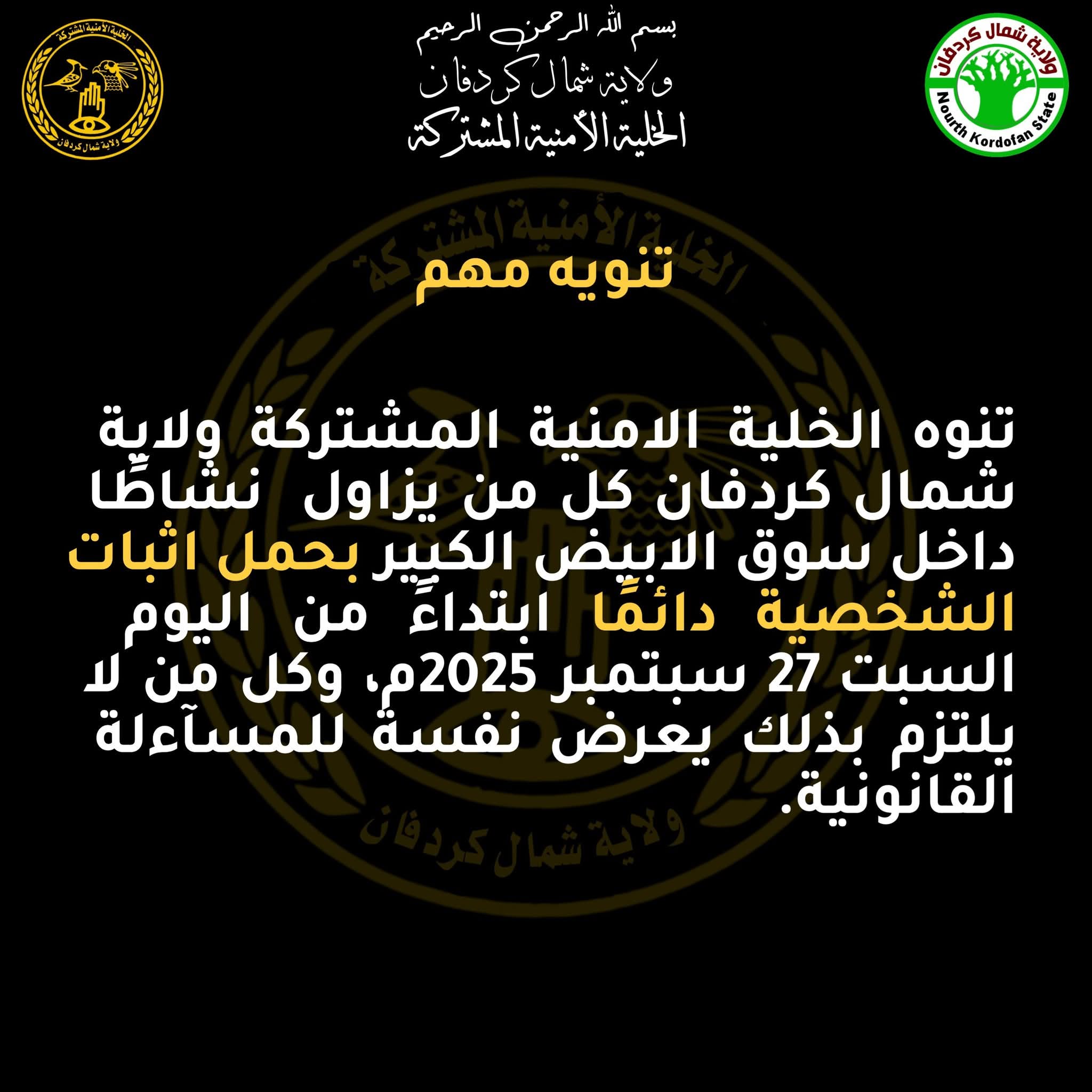 متابعات–السودان الآن ـ أعلنت الخلية الأمنية المشتركة بولاية شمال كردفان عن تطبيق قرار جديد يلزم جميع العاملين في سوق الأبيض الكبير بحمل أوراق إثبات الهوية اعتبارًا من يوم السبت المقبل