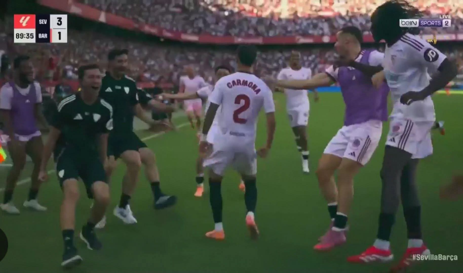 إشبيلية خوسيه أنخيل كارمونا 90’ استغل ارتباك الدفاع الكتالوني وسدد كرة صاروخية داخل الشباك.