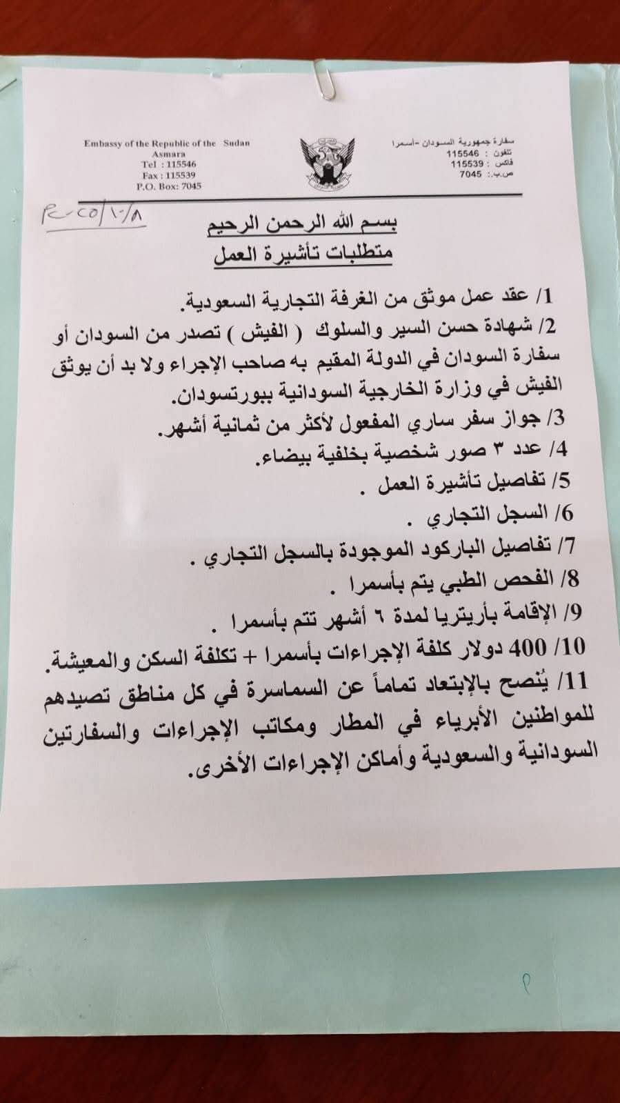 السفارة السودانية بأسمرا تعلن متطلبات تأشيرة العمل بالسعودية وتحذر من السماسرة