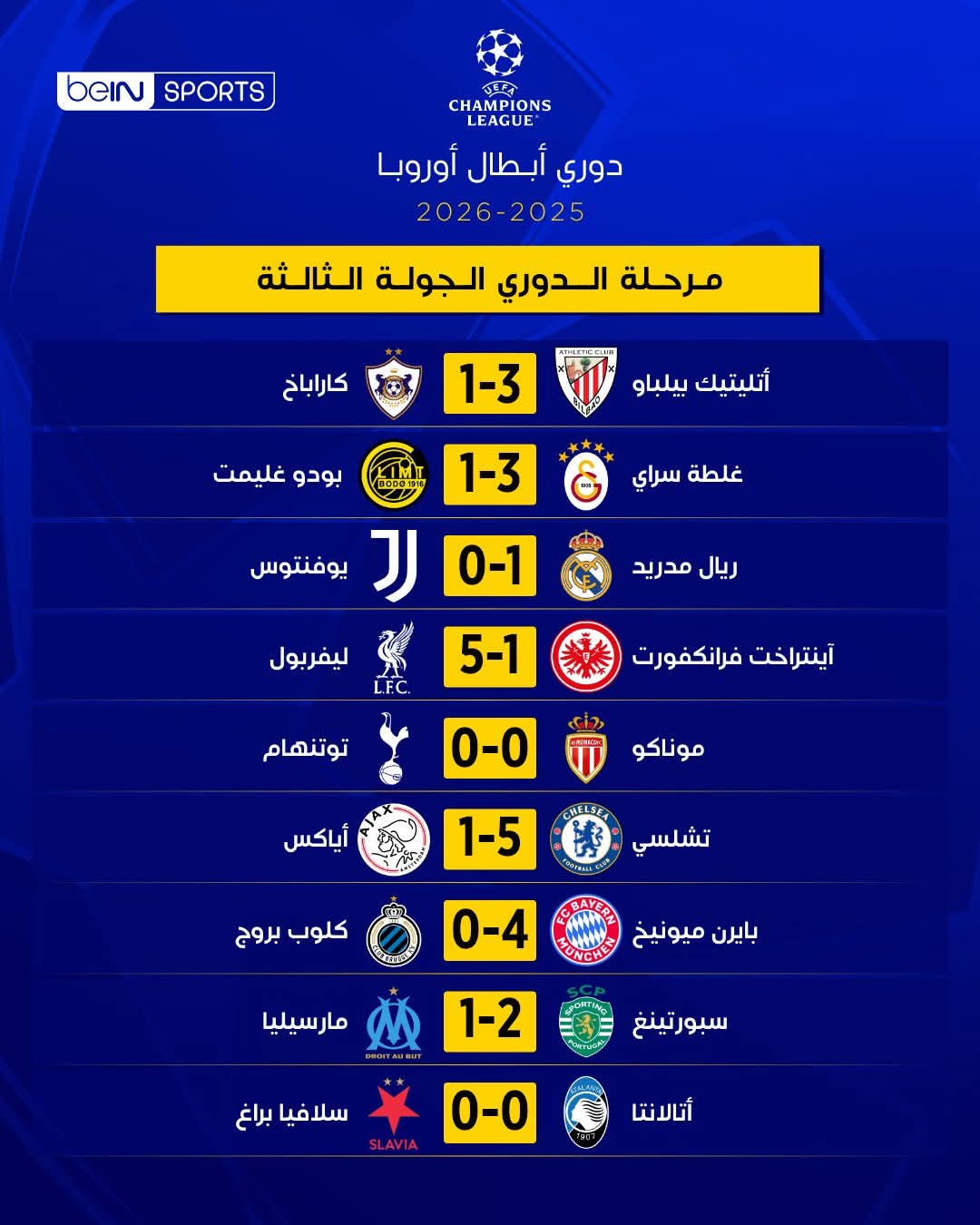 متابعات – السودان الآن – اختُتمت مباريات الجولة الثالثة من مرحلة الدوري في دوري أبطال أوروبا موسم 2025-2026، والتي شهدت مواجهات قوية بين كبار القارة الأوروبية، وجاءت نتائج الأربعاء على النحو التالي:
