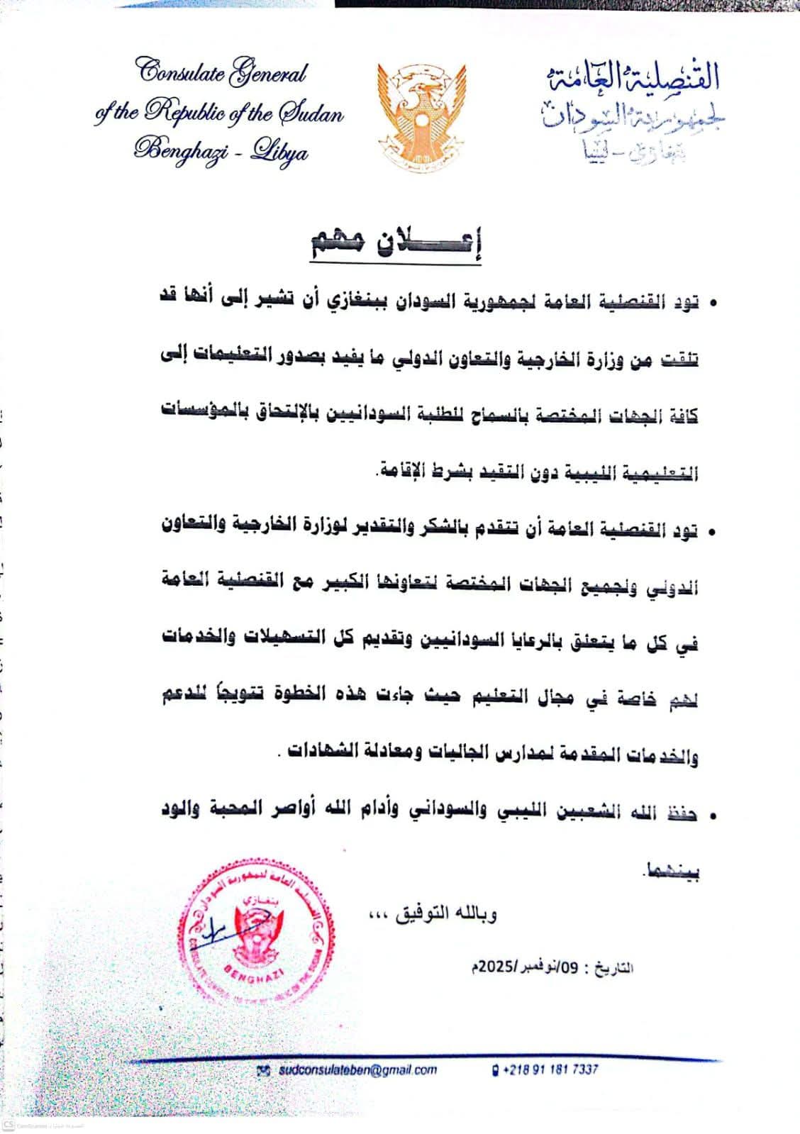 ويأتي هذا القرار كتسهيل رسمي للطلاب السودانيين المقيمين في ليبيا والراغبين في مواصلة تعليمهم في المدارس والجامعات والمعاهد، بعد فترة من العقبات المتعلقة بإجراءات القبول والمتطلبات الإدارية.