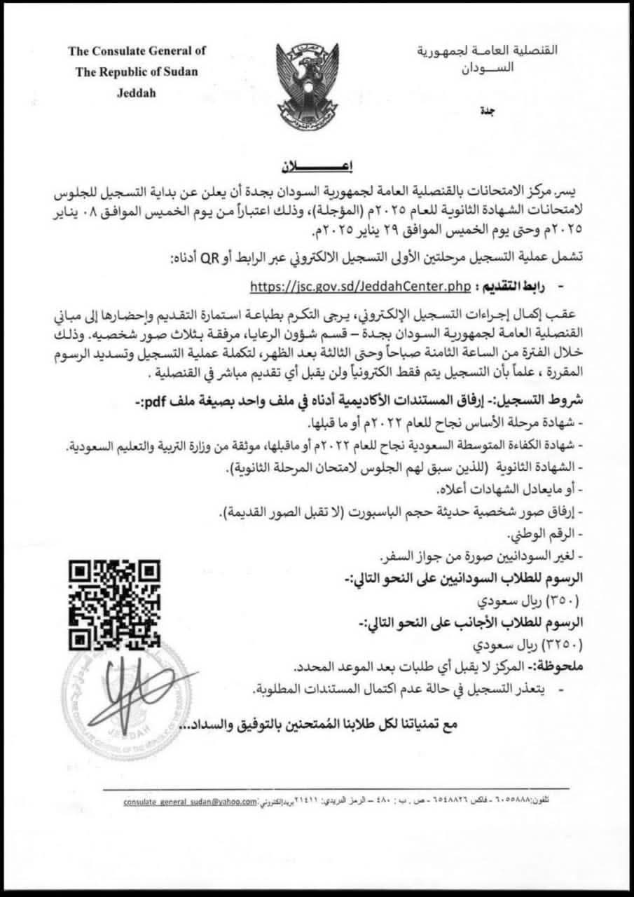 متابعات – السودان الآن -أعلنت القنصلية العامة لجمهورية السودان بمدينة جدة بالمملكة العربية السعودية عن فتح باب التسجيل لامتحانات الشهادة الثانوية السودانية للعام الدراسي 2025م، وذلك بمقر القنصلية.