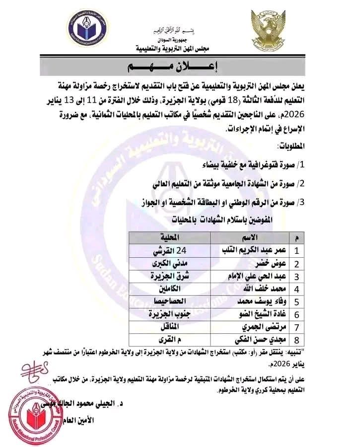 متابعات – السودان الآن – أعلن مجلس المهن التربوية والتعليمية عن بدء استقبال طلبات استخراج رخصة مزاولة مهنة التعليم للدفعة الثالثة (18 قومي) بولاية الجزيرة، خلال الفترة من 11 إلى 13 يناير 2026م.