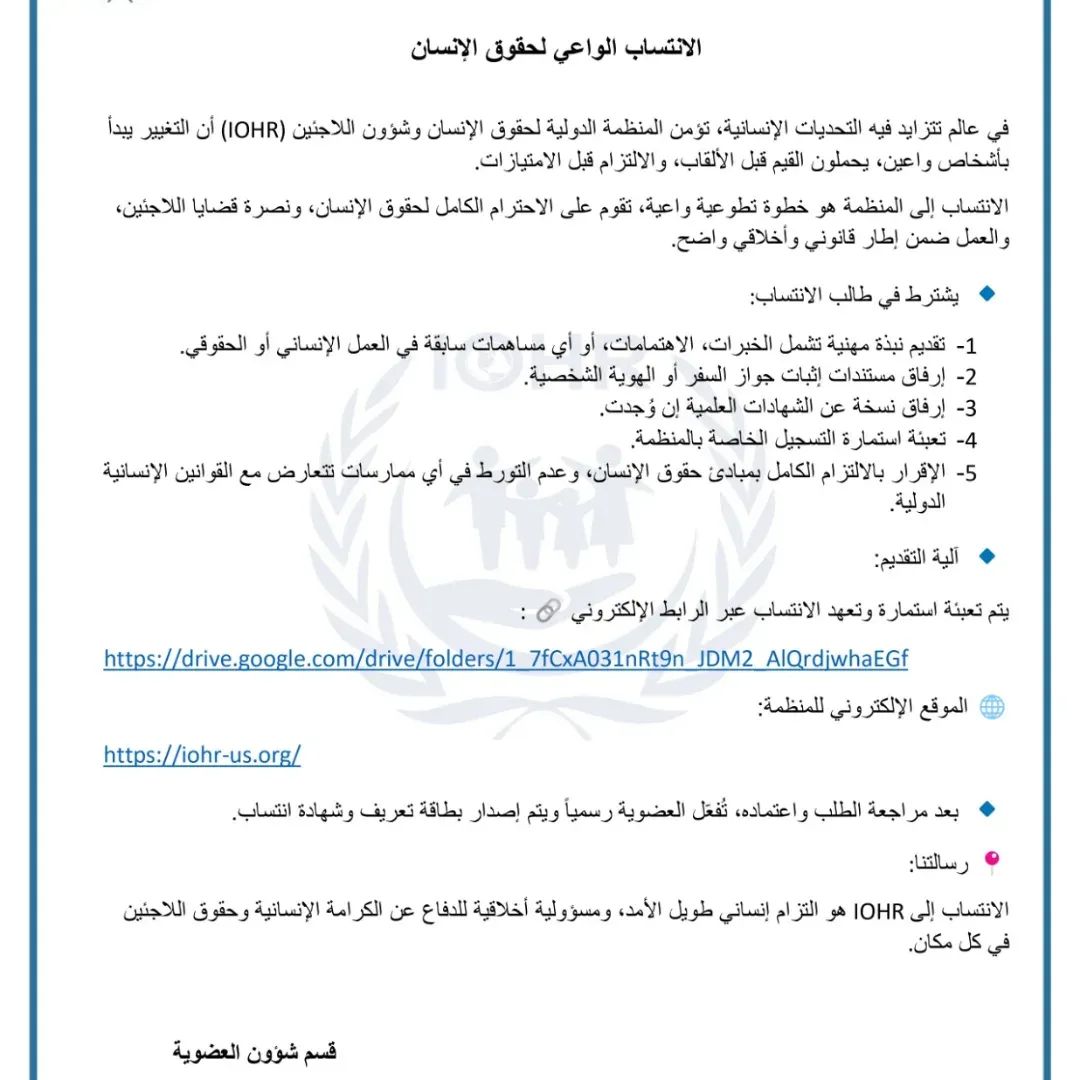 المنظمة الدولية لحقوق الإنسان وشؤون اللاجئين تعلن آلية الانتساب ودورها الإنساني