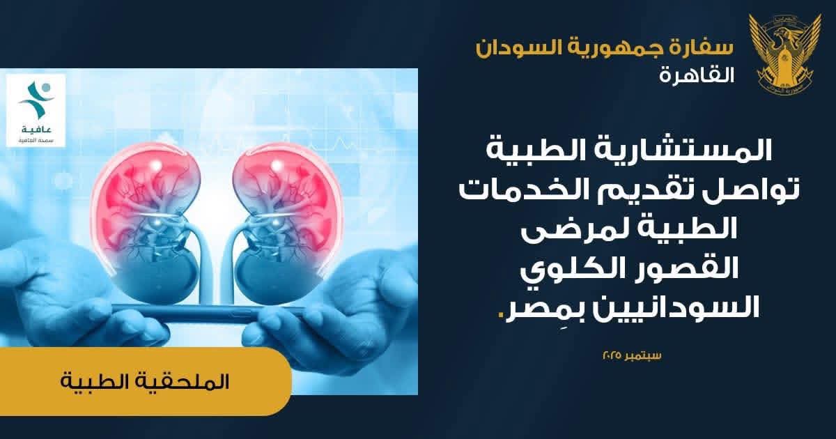 كما أفادت المستشارية باستمرار إيصال الأدوية الخاصة بمرضى زراعة الكلى إلى مواقع سكنهم، مع التأكيد على أن العمل متواصل لضمان تقديم خدمات علاجية ملائمة ومستمرة للمرضى السودانيين.