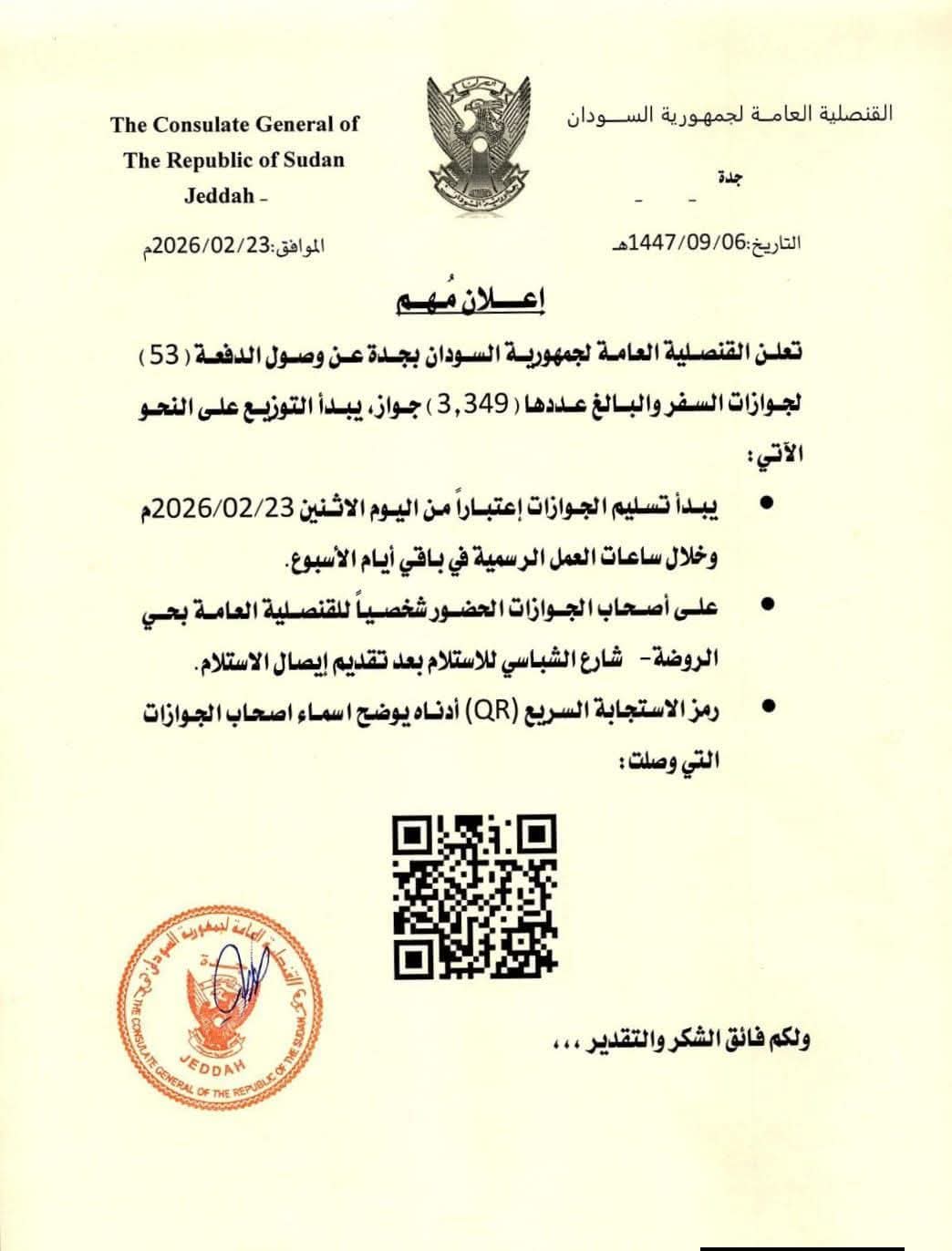 ودعت القنصلية المواطنين الذين سبق لهم التقديم لاستخراج الجوازات إلى متابعة الإعلانات الرسمية الصادرة عنها لمعرفة مواعيد الاستلام وآليات الحضور، مع الالتزام بالإجراءات التنظيمية داخل مقر القنصلية.