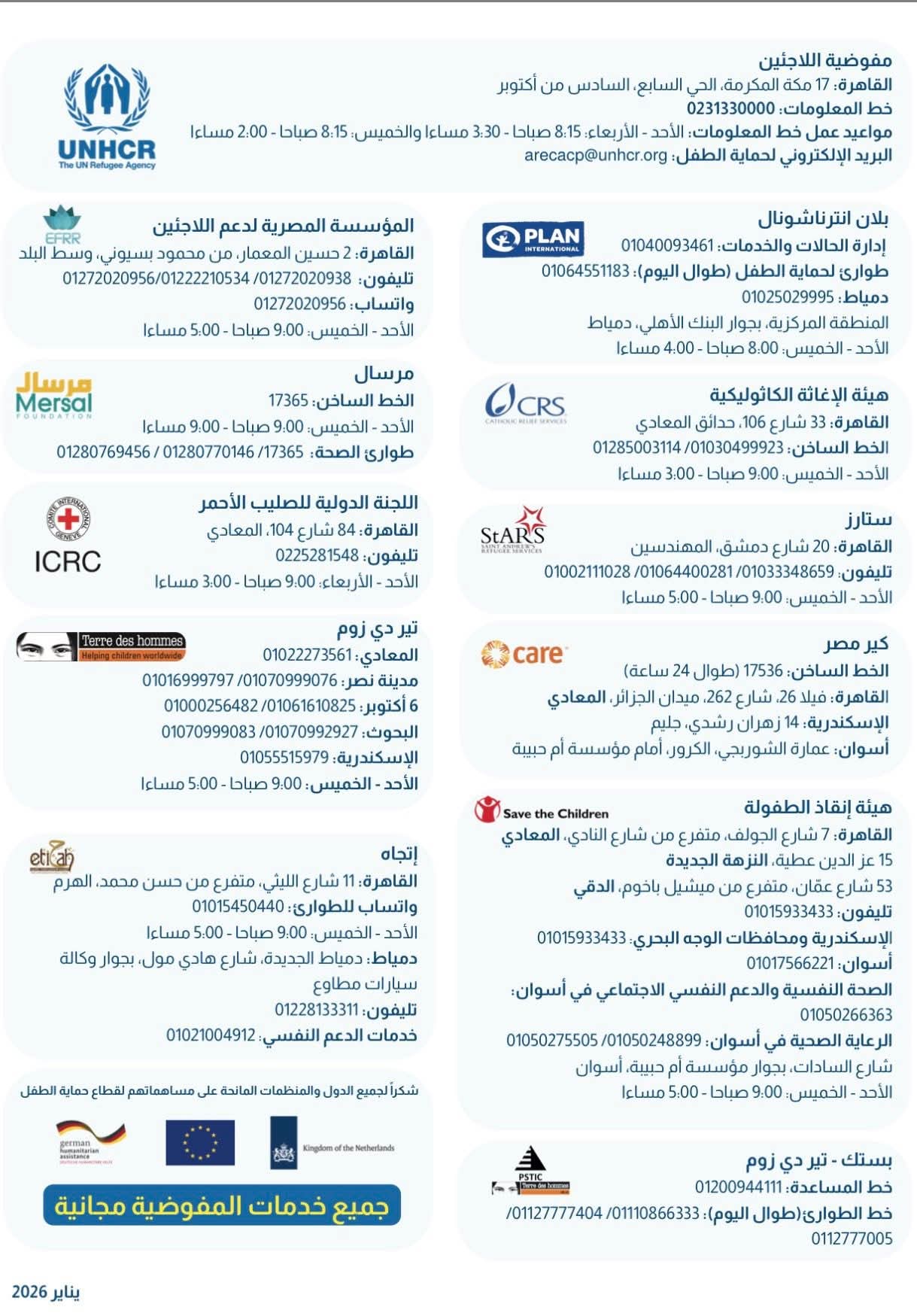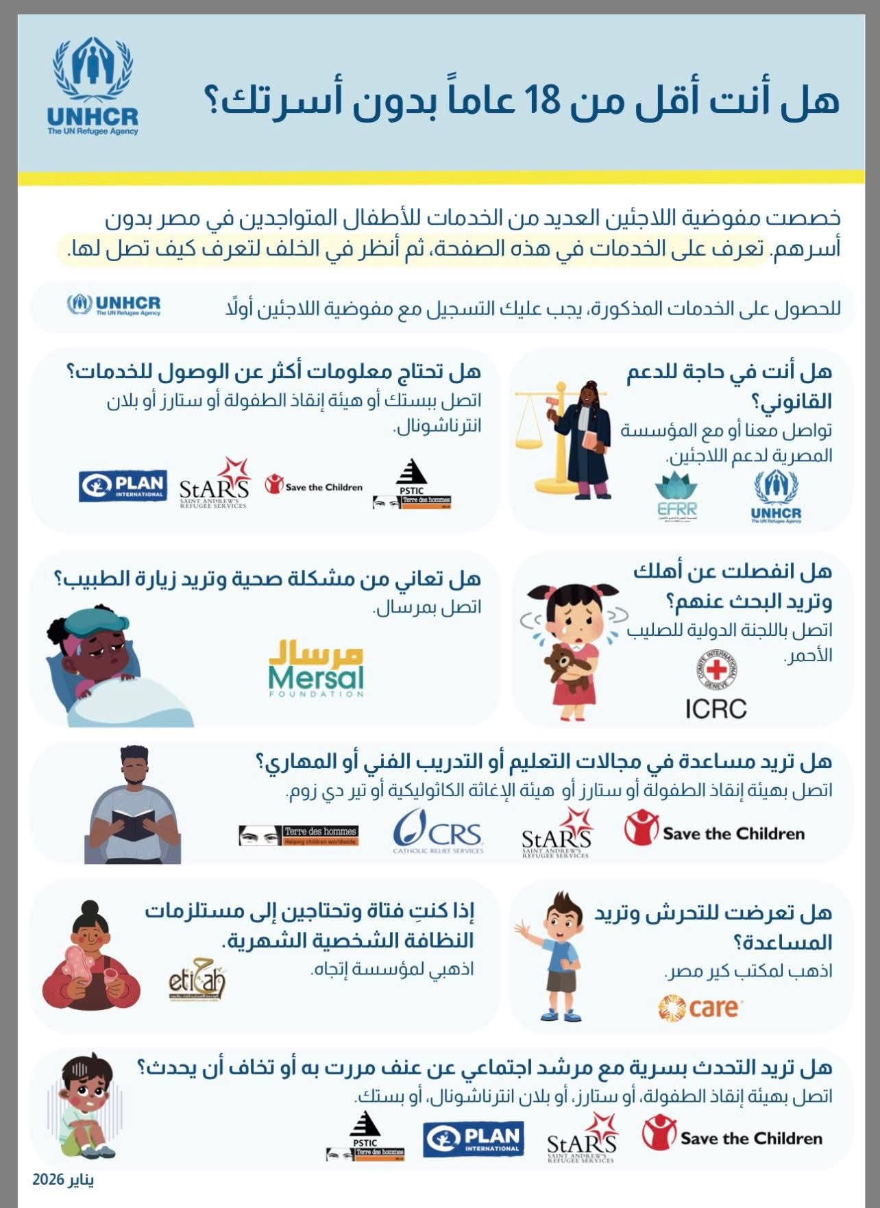 متابعات – السودان الآن – خصصت مفوضية الأمم المتحدة لشؤون اللاجئين وعدد من المنظمات الشريكة خدمات حماية ودعم للأطفال غير المصحوبين أو المنفصلين عن أسرهم في مصر، وتشمل الحماية القانونية، الرعاية الصحية، التعليم والتدريب، الدعم النفسي والاجتماعي، بالإضافة إلى مساعدات أساسية للفتيات والفتيان المحتاجين.
