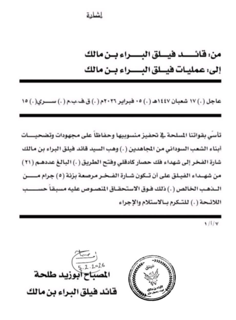 متابعات – السودان الآن – أفادت معلومات واردة بإصدار إشارة عسكرية داخلية تفيد بمنح قائد فيلق البراء بن مالك، المصباح طلحة، “شارة الفخر” لشهداء معارك فك حصار كادوقلي وفتح الطريق.