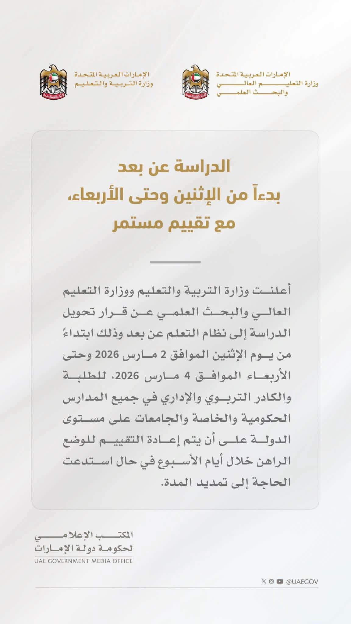 متابعات – السودان الآن – أعلنت الإمارات العربية المتحدة تعليق الدراسة في المؤسسات التعليمية حتى إشعار آخر، في خطوة احترازية ضمن الإجراءات المتخذة في ظل التطورات الأمنية الراهنة.