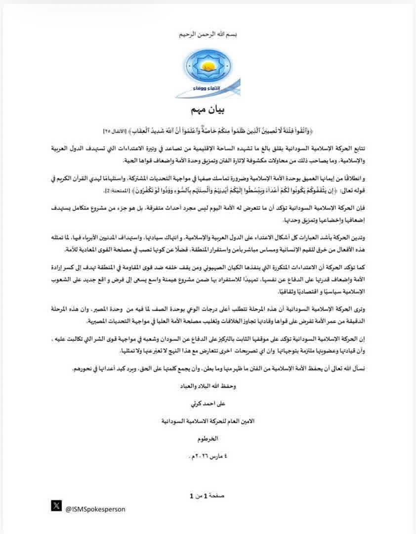 بيان للحركة الإسلامية السودانية بشأن تطورات الساحة الإقليمية