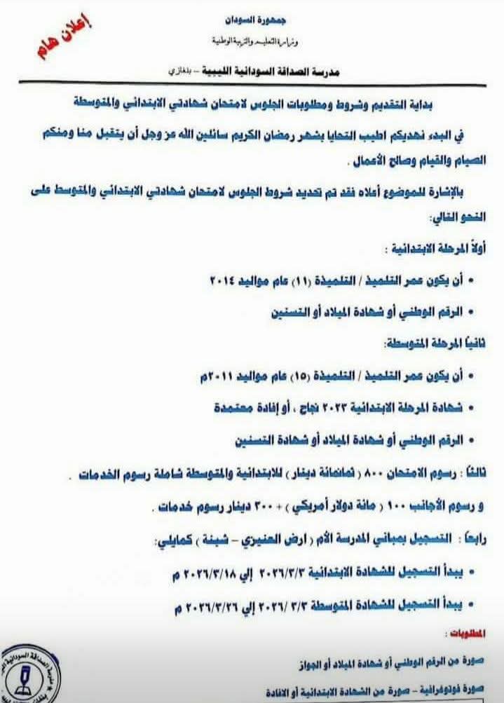 متابعات – السودان الآن – أثار إعلان مدرسة الصداقة السودانية الليبية ببنغازي بشأن ترتيبات امتحانات الشهادتين الابتدائية والمتوسطة جدلاً واسعاً بين الطلاب وأولياء الأمور، بعد أن حددت المدرسة رسومًا مرتفعة بلغت: