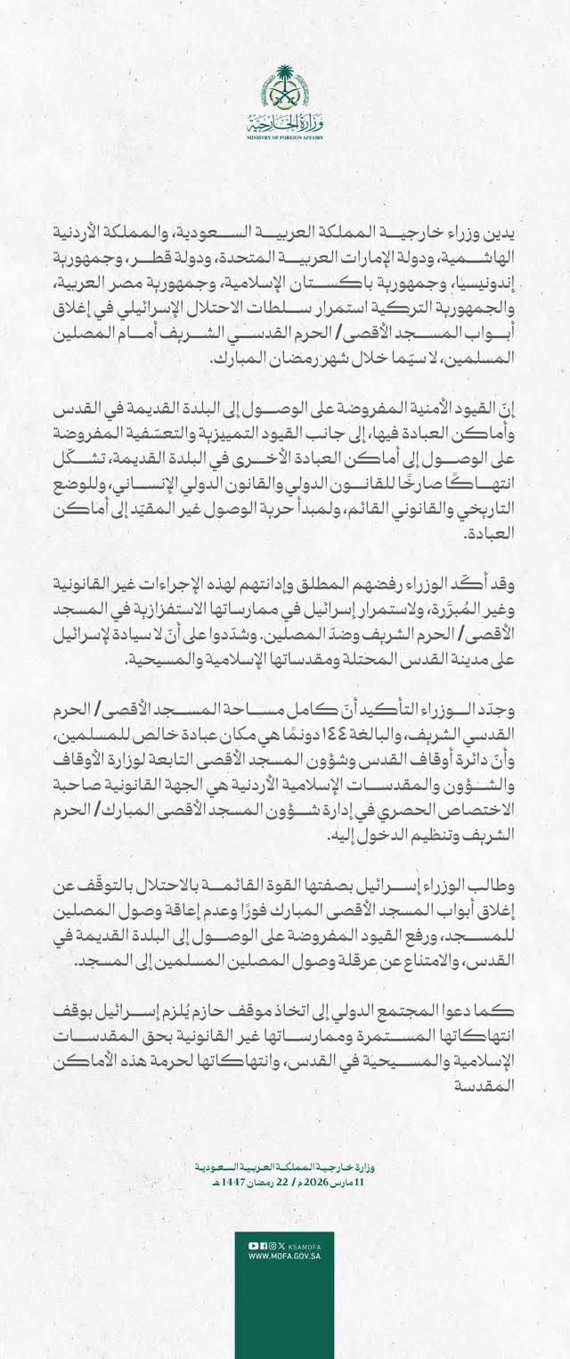بيان مشترك لثماني دول أبرزها السعودية والإمارات وتركيا يـ.دين تصرف إسرائيل