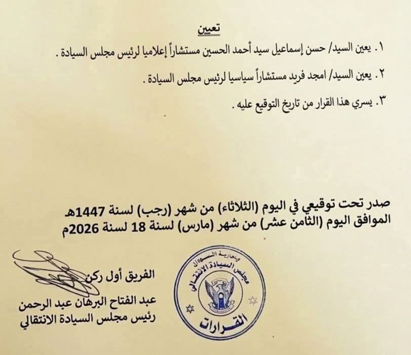 متابعات -السودان الآن – 19/3/2026-أكدت رشان أوشي، نقلاً عن مصادر رفيعة، أن الخطاب المتداول بشأن تعيين حسن إسماعيل مستشارًا لرئيس مجلس السيادة هو خطاب مزور ولم يصدر عن فخامة رئيس مجلس السيادة.