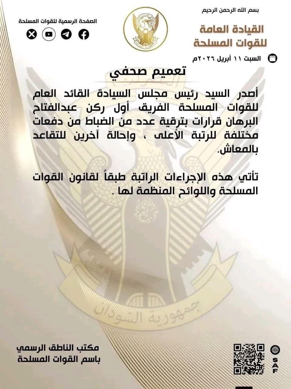 متابعات – السودان الآن -11/4/2026- أصدر القائد العام للقوات المسلحة الفريق أول ركن عبدالفتاح البرهان قرارات جديدة شملت إحالات وترقيات في صفوف الضباط برتبة اللواء، وذلك في إطار التعديلات المستمرة على هيكلة القيادة العسكرية.