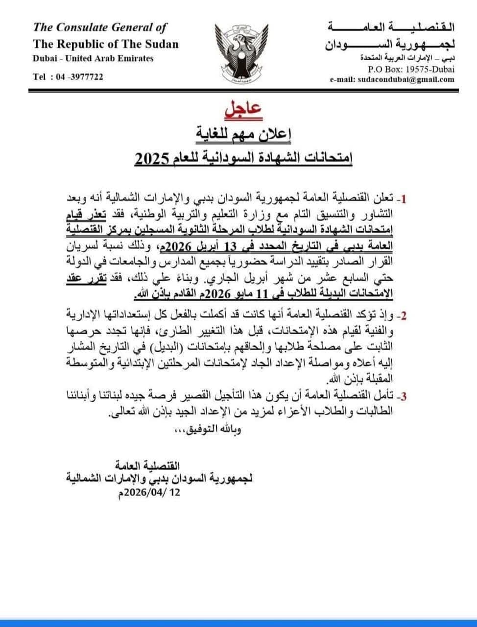 متابعات – السودان الآن – 12/4/2026- أعلنت قنصلية جمهورية السودان في دبي عن تعذر قيام امتحانات الشهادة السودانية التي كان مقرراً انعقادها يوم غدٍ الاثنين، دون توضيح تفصيلي للأسباب في البيان المقتضب الذي صدر قبل وقت قصير من موعد الامتحان.