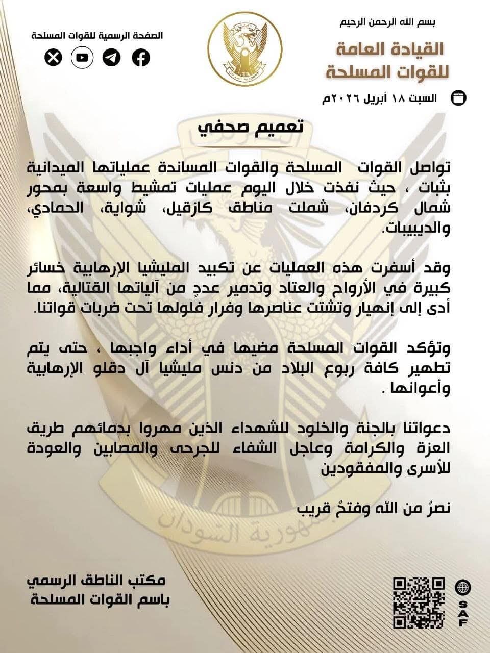 متابعات – السودان الآن – 18/4/2026- أعلن الجيش السوداني تنفيذ عمليات تمشيط واسعة في محور شمال كردفان، شملت مناطق كازقيل، وشواية، والحمادي، والدبيبات، في إطار تحركات ميدانية متواصلة بالمنطقة.