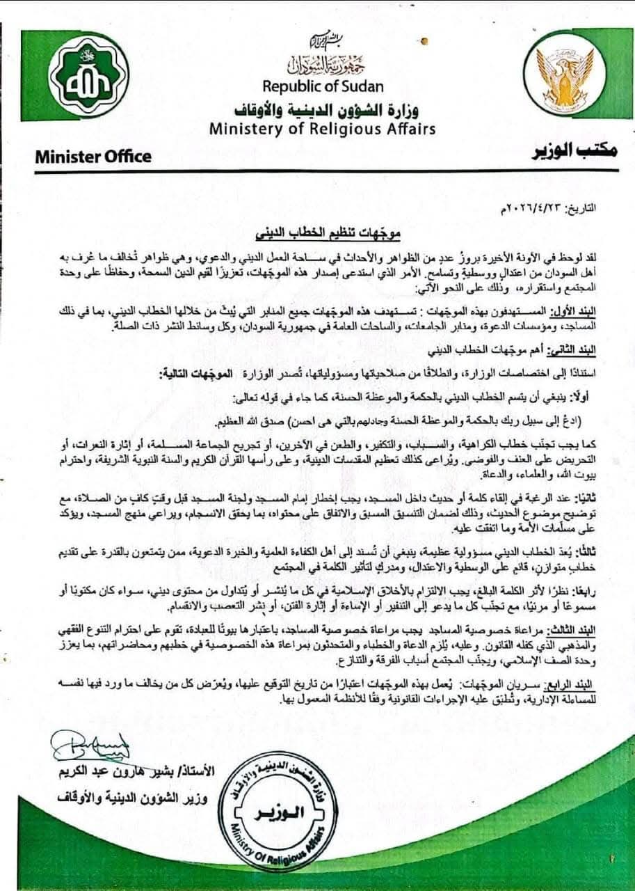 متابعات – السودان الآن – 23 أبريل 2026 —أصدرت وزارة الشؤون الدينية والأوقاف في السودان توجيهات جديدة لتنظيم الخطاب الديني، وذلك في إطار تعزيز قيم الاعتدال والوسطية، والحفاظ على وحدة المجتمع واستقراره.