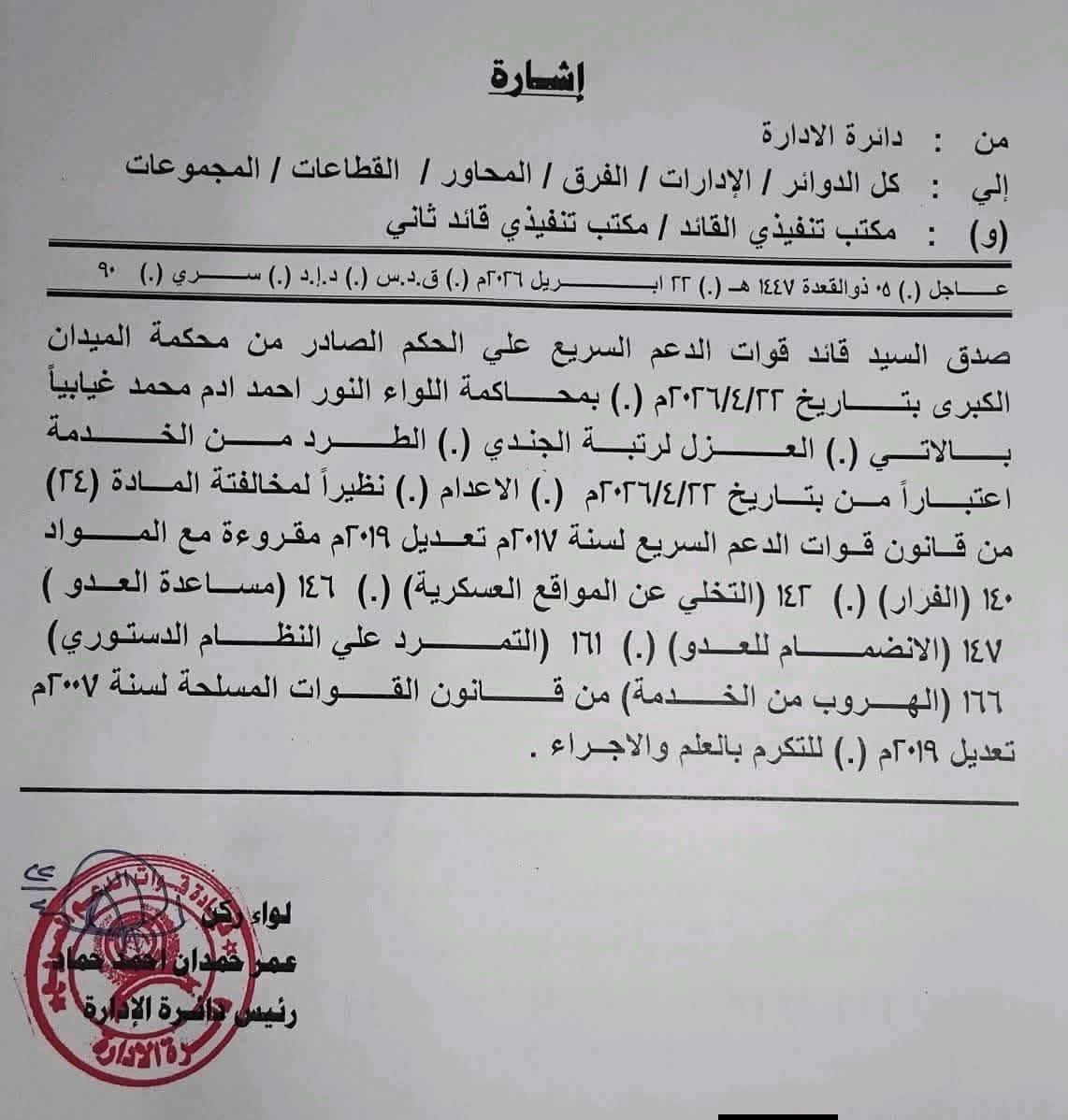 وبحسب المعلومات المتداولة، استند الحكم إلى اتهامات تتعلق بمخالفة قوانين عسكرية، شملت الفرار من الخدمة، والتخلي عن مواقع عسكرية، ومساعدة جهة معادية والانضمام إليها، إلى جانب تهم التمرد حسب ما ورد.